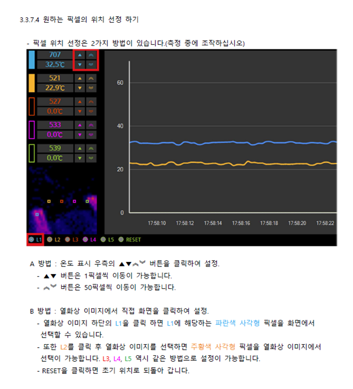 1,024픽셀(32ⅹ32) , PC를 통한 간편한 온도측정 , 실시간 온도 저장 및 Chart View , 최대 5 포인트 알람 및 로깅